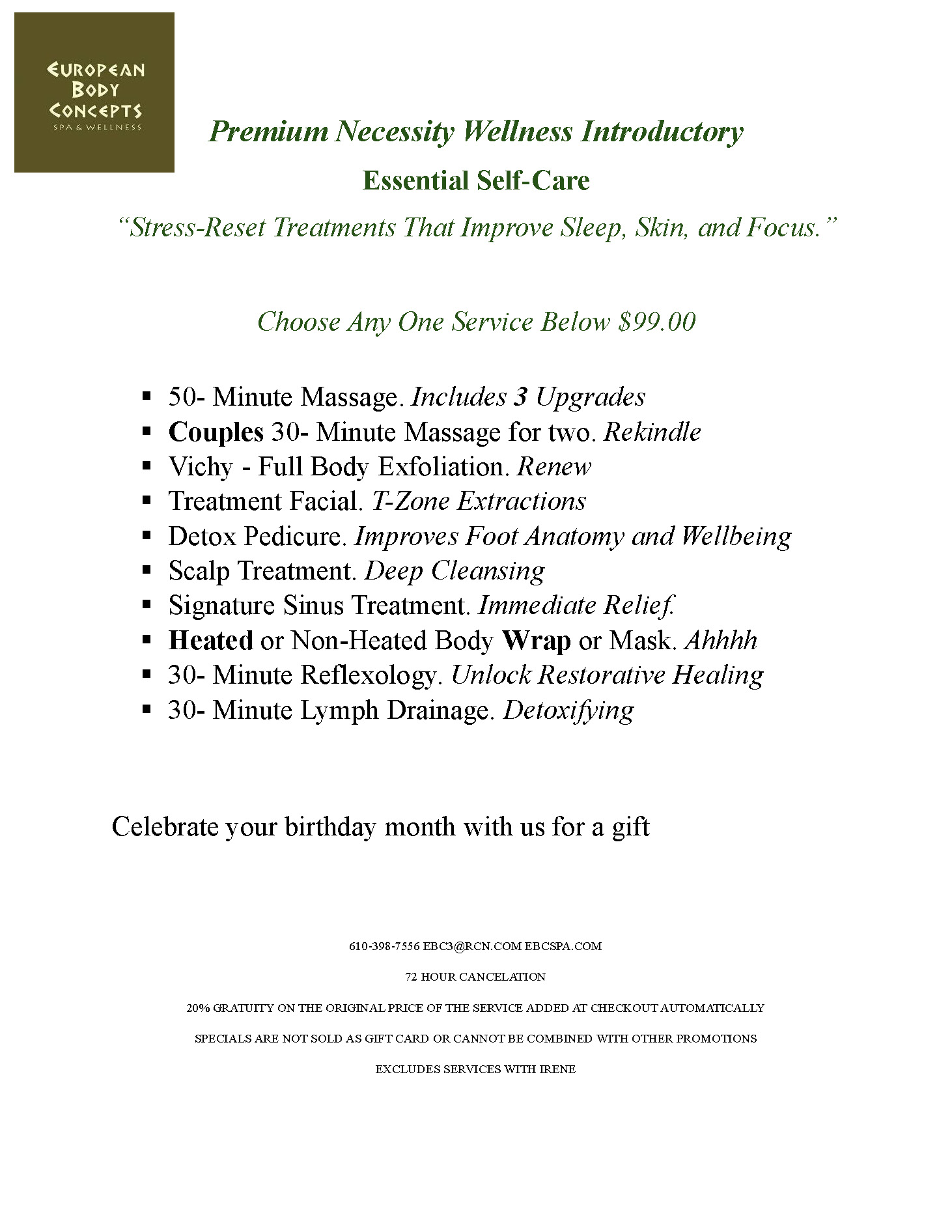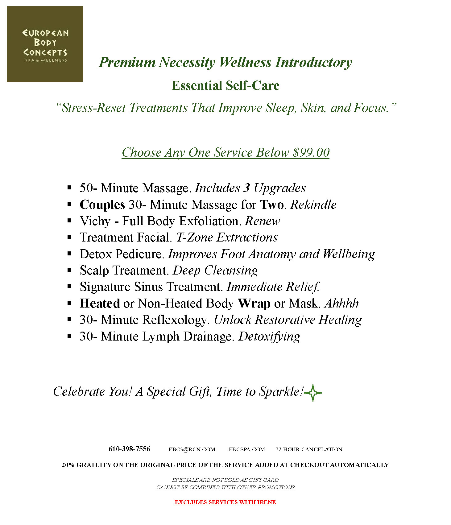 European Body Concepts offers an abundance of salon and spa services that will transport you to a world of comfort, relaxation & restoration.